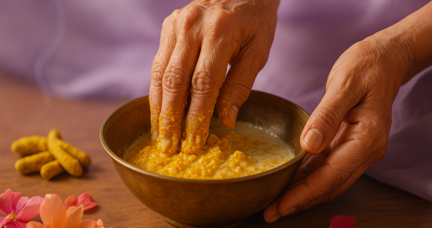 A pinch of turmeric, a spoonful of gram flour, a drop of buttermilk, and the quiet rhythm of morning light on her skin.