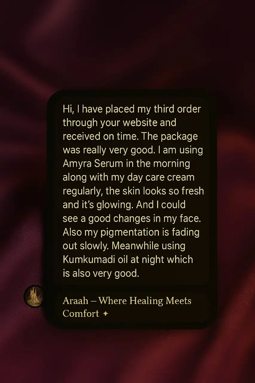 - For night use — follow with Yeka Golden Glow Oil (for dry skin) or Araah Kumkumadi Serum (for oily skin) to complete your 24-hour glow cycle.