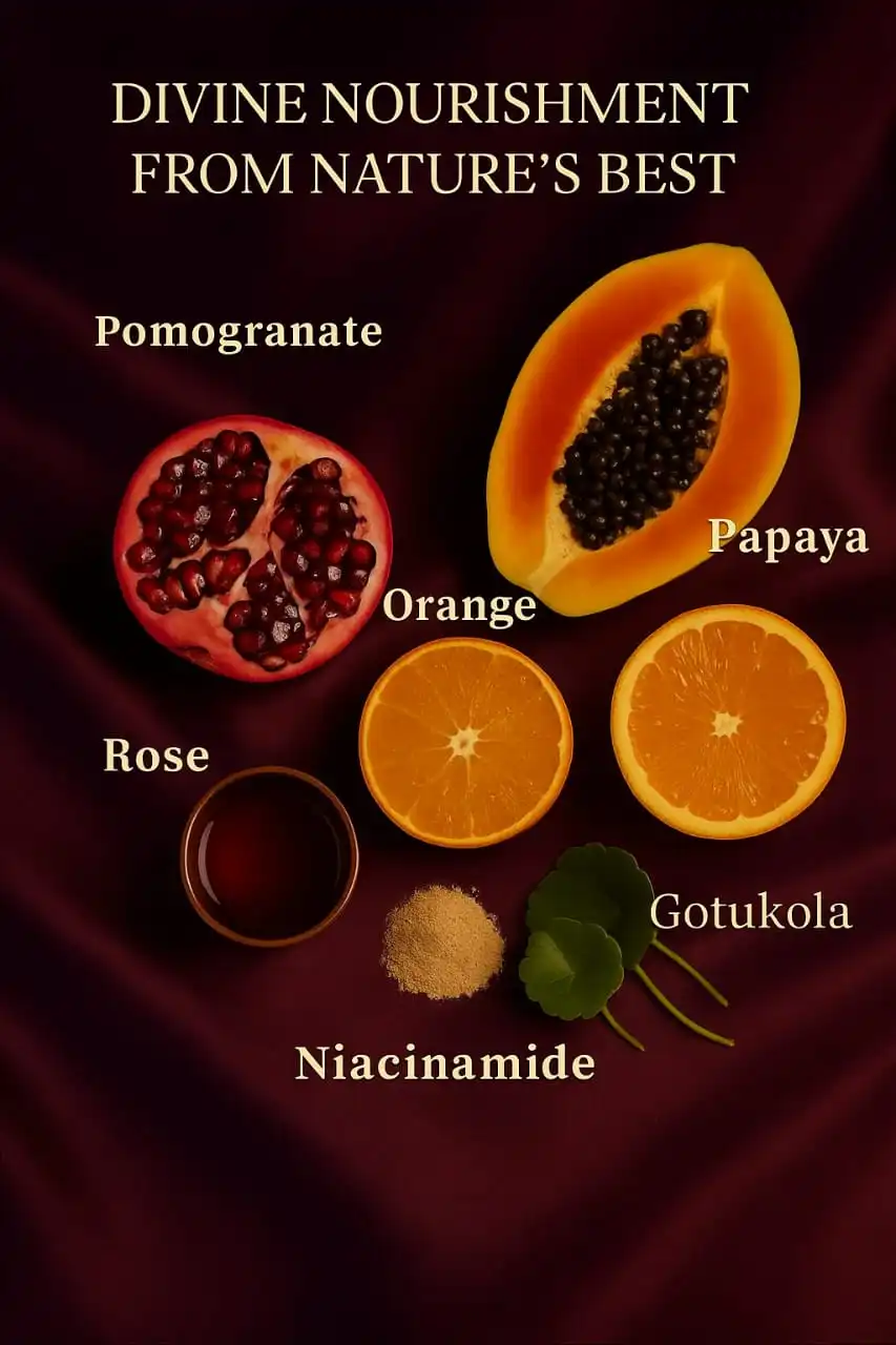 A blend of 11 sacred botanicals — Papaya, Orange, Licorice, Pomegranate, Gotu Kola, Tulasi, Ashwagandha, Amla, Green Tea, Tomato, and Glycerin — each chosen to heal, brighten, and protect. Together, they form an energy field that revives life force within your skin.
