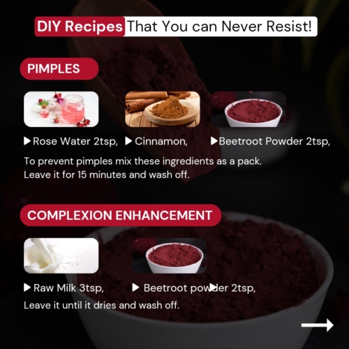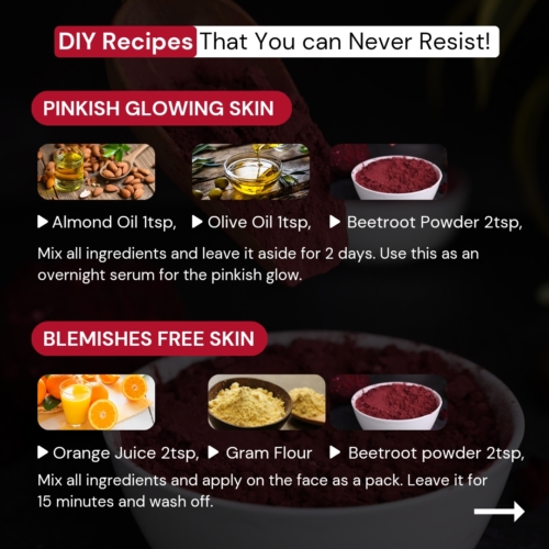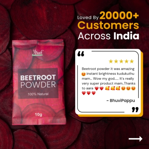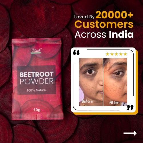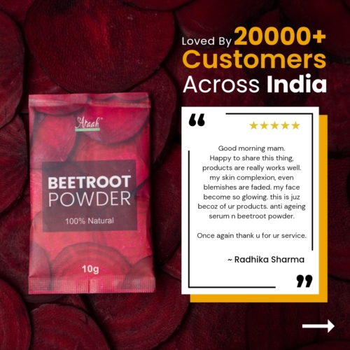 ARAAH Beetroot Powder is rich in vitamins, minerals, and antioxidants that can promote healthier skin and hair. It helps in improving skin complexion, reducing blemishes, and nourishing hair follicles for shinier, stronger locks.