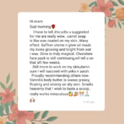 Gud morning I have to tell ,the pdts u suggested for me are really wow.. carrot soap is like wax coated on my skin..Waxy effect. Saffron creme n glow oil made my looks glowing and bright from wat i was. Glow is truly magical. Chocolate face pack is still continuing.wil tell u on that aft few weeks. Still more to work on my skin,damn sure I will succeed with yeka n aarah. Proudly recommending others now. Vannilla body butter, is soooo greasy, floating and crremy on dry skin. Smells heavenly that I wish to taste a scoop.. really works miraculous