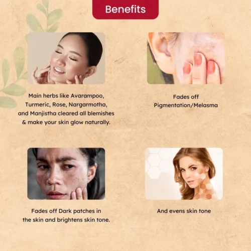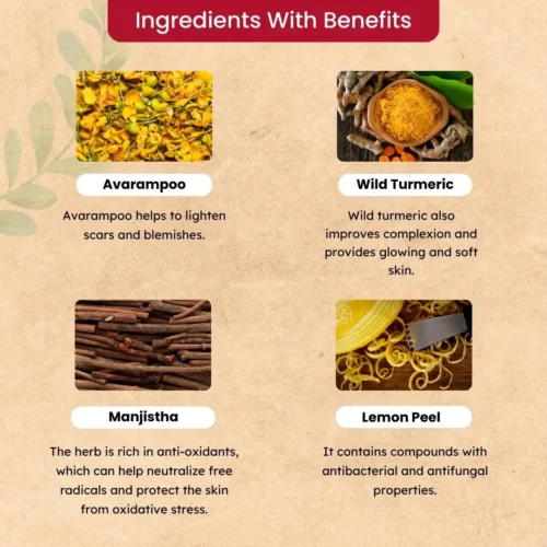 Avarampoo (Cassia auriculata): Rich in antioxidants, may contribute to skin health and anti-aging. Traditionally used for blood purification and skin-related issues.