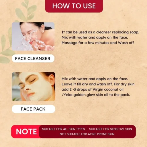 For dry skin add 2 -3 drops of Virgin coconut oil /Yeka golden glow skin oil to the pack.