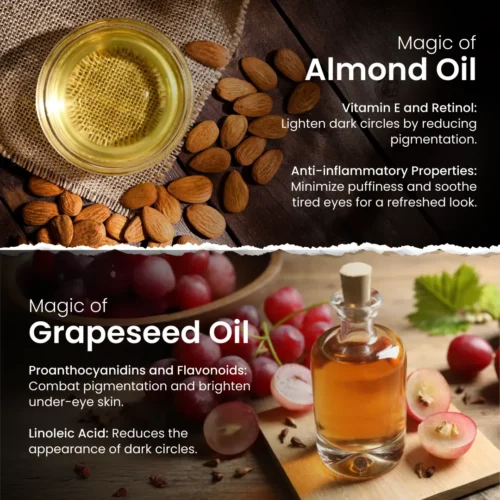 Known for its softness and skin compatibility, almond oil deeply nourishes dry under-eye skin. It helps maintain suppleness, reduces dryness-related discomfort, and supports smooth, well-conditioned skin around the eyes.