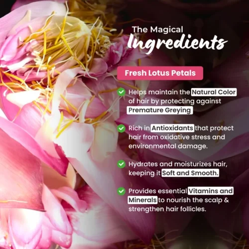 Lotus extracts- Lotus extracts help in enhancing the elasticity of hair. It makes the hair stronger and also adds that extra volume to your hair. Lotus oil boosts the growth of hair and makes it shiny and healthy. Intense repair for healthier is possible with Lotus Oil.