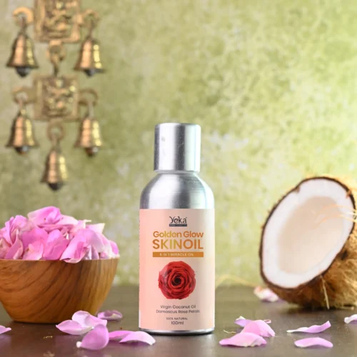 Give yourself a youthful glow with golden glow oil Made with the flower of youth Damascus Rose and Pure virgin coconut oil, this is the traditional elixir of your skin. The mood-elevating rose enhances your skin tone naturally and the virgin coconut oil deeply nourishes your skin. As a result, well-nourished glowing skin is all yours to flaunt. Witness the dramatic change in the look of skin with this oil.