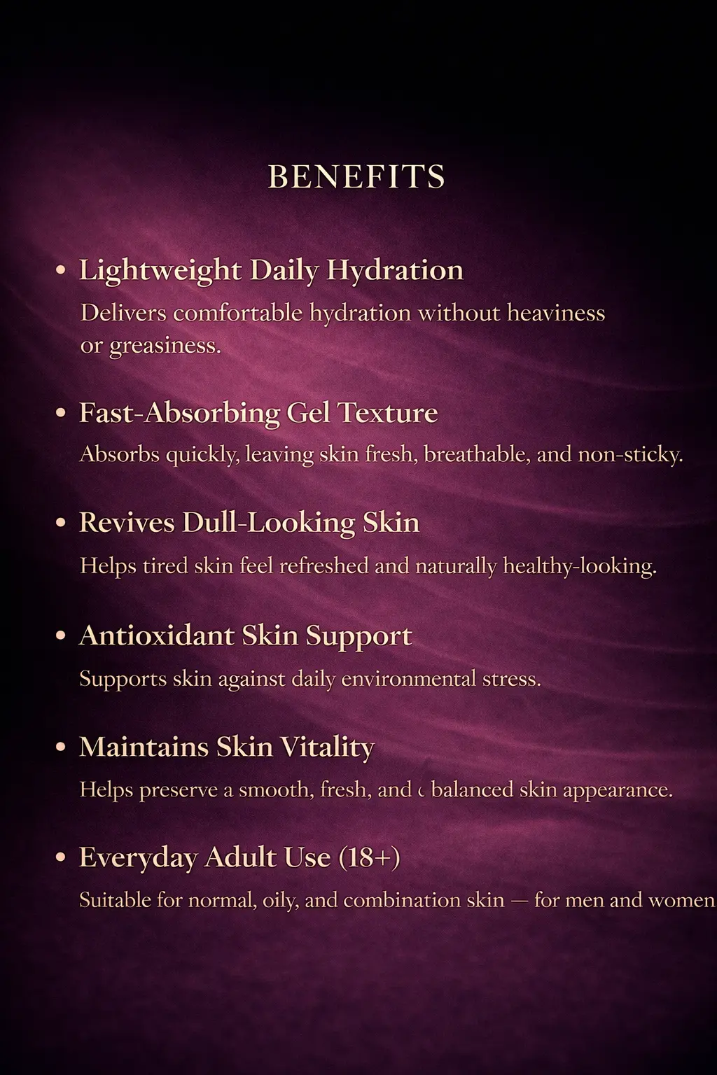 Formulated with a humectant-rich gel base, this gel helps maintain skin hydration while remaining light, breathable, and non-greasy — ideal for everyday use.