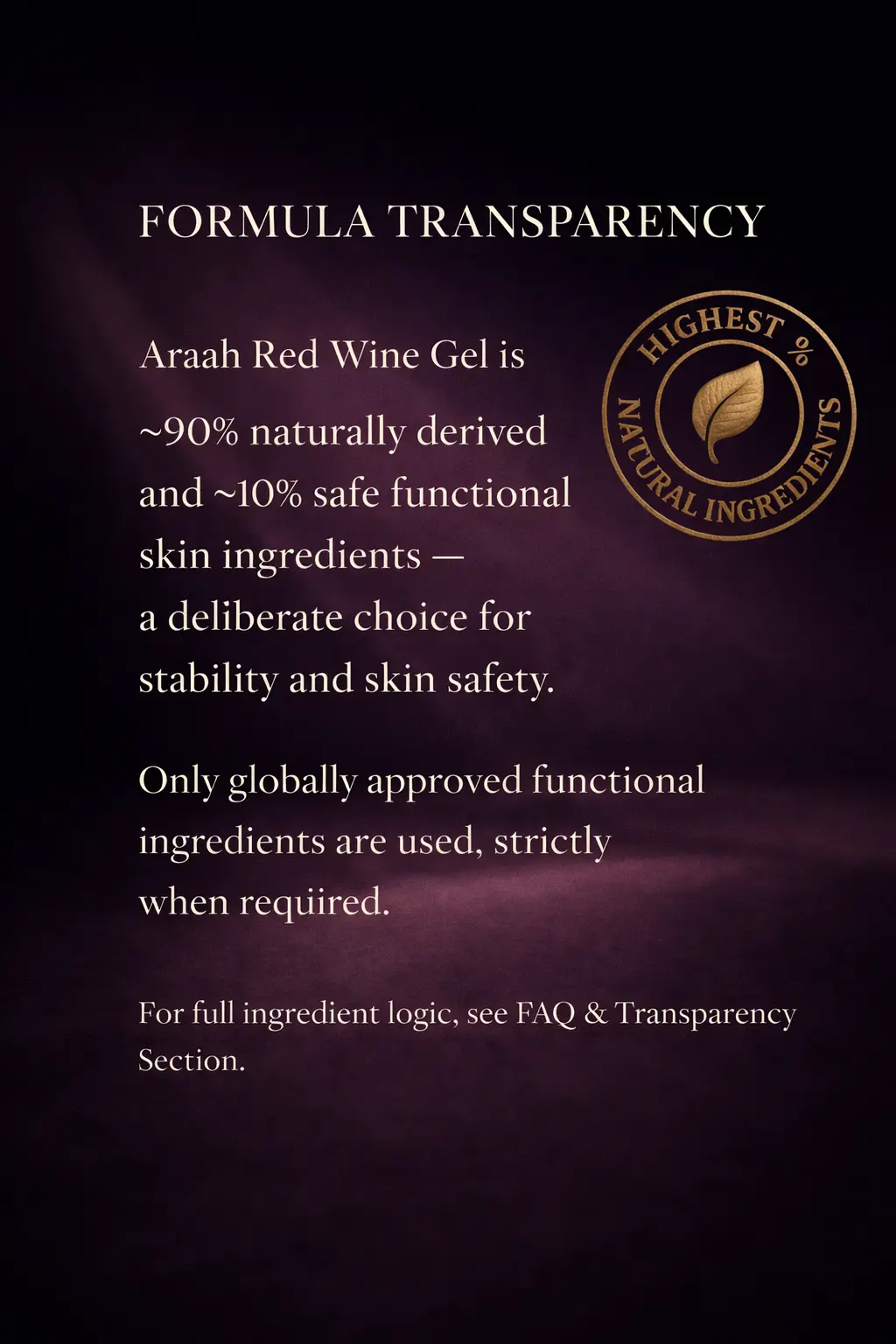 In Araah’s philosophy, red wine represents measured indulgence and controlled vitality — powerful when balanced, harmful when overused. This gel reflects that same principle.