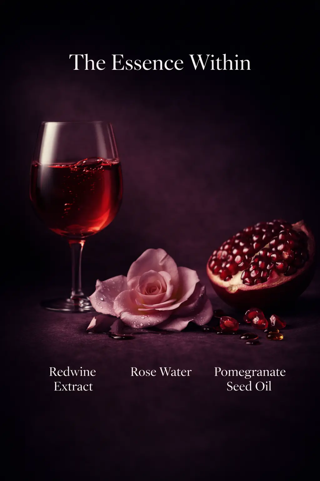 Rather than altering skin colour or tone, red wine supports skin vitality — helping tired, dull skin feel refreshed and alive.