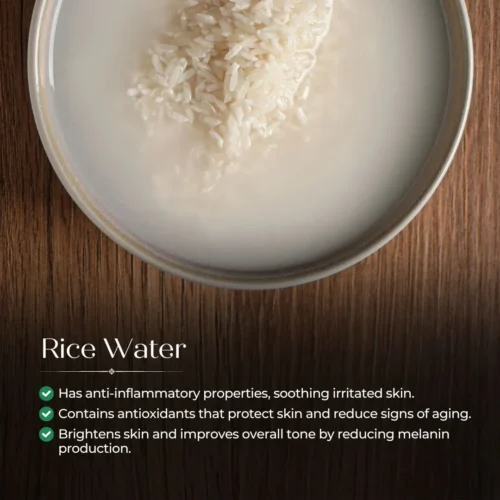 Rice Water: Contains antioxidants that protect skin and reduce signs of aging. Its anti-inflammatory properties soothe irritated skin, while its ability to brighten skin improves overall tone by reducing melanin production.
