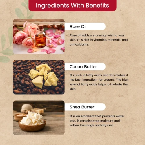 Cocoa Butter – It is rich in fatty acids which makes it the best ingredient for creams. The high level of fatty acids helps to hydrate the skin. It prevents the loss of moisture and keeps dryness out.