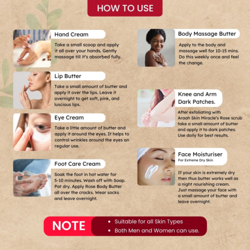 Are you tired of hiding your flaky skin? We, at Araah Skin Miracle heard about your trouble. That’s why we created the best body butter for rough skin-Rose Body Butter. Now you can pamper, smoothen and soften your rough skin with this best body lotion for skin. Rose body butter is loaded with 100 percent pure cocoa, shea butter, and Rose extracts. This combination works wonders on your rough, dry, and flaky skin. This is the best, body butter can go, as the nourishing property of rose, cocoa, and shea butter deeply hydrates your flaky skin and protects your skin from damage. Rose is a champion ingredient for skin. It revives, rejuvenates, hydrates prevents aging, and enhances skin tone. You can easily beat your dry and rough skin with this body butter
