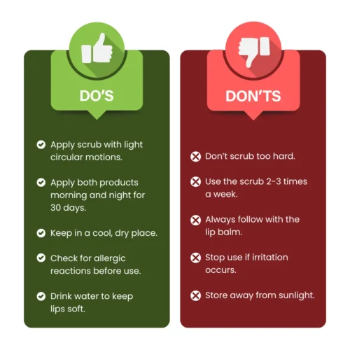 Step 1 : Before applying the lip scrub, make sure your lips are clean and dry. Take a small amount of the lip scrub and gently massage it onto your lips in a circular motion for 30-60 seconds.