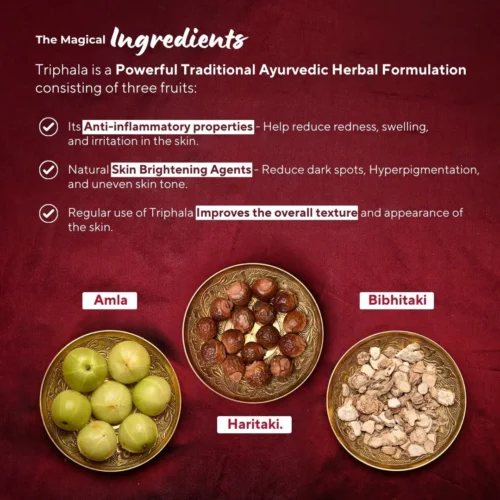 This Triphala as a whole can keep you young always, fight dark spots, dark circles, pigmentation, thwart acne, and also maintains Ph balance of the skin