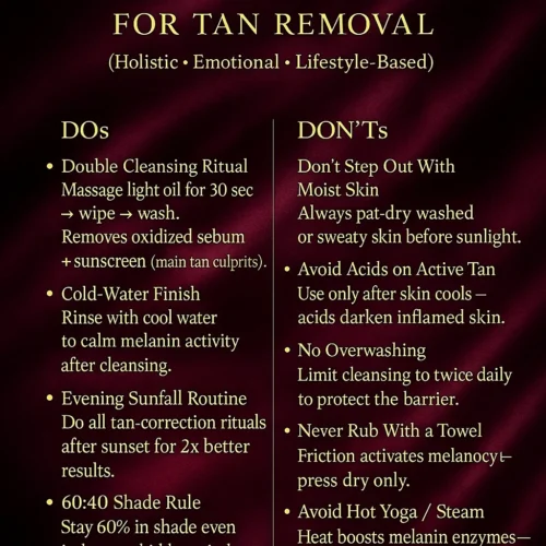 This reduces heat, inflammation & micro-pigmentation built through the day.2. DON’TS — Hidden Triggers That Deepen Tan