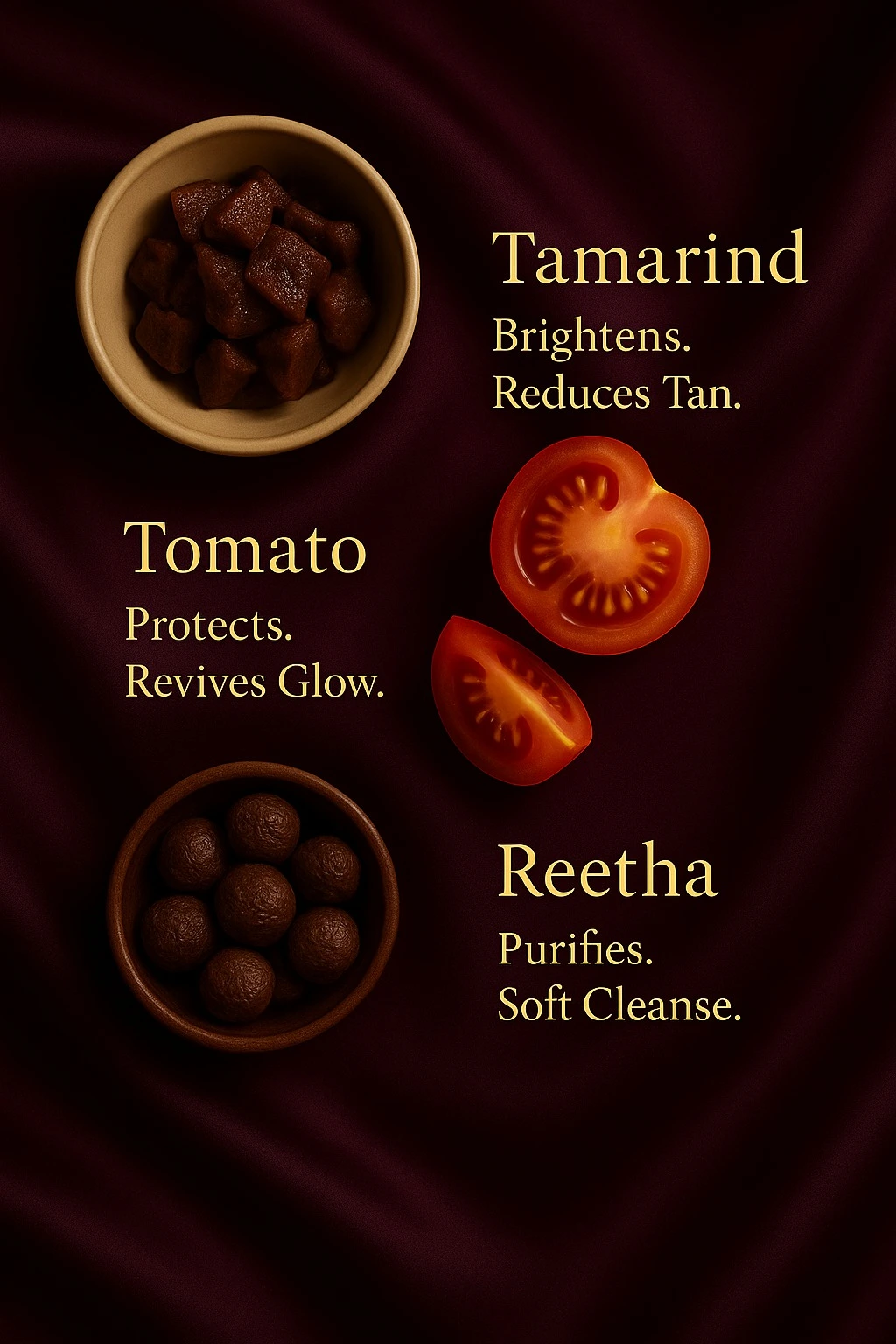 Rich in natural alpha-hydroxy acids, tamarind gently dissolves tan, dullness and dead skin buildup. It brightens the complexion, fades uneven tone and brings out fresh, renewed radiance — without harsh chemicals.