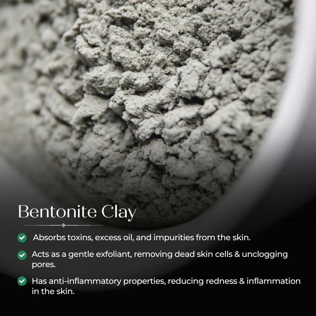 Bentonite Clay: Absorbs toxins, excess oil, and impurities from the skin. Acts as a gentle exfoliant, removing dead skin cells and unclogging pores. Its anti-inflammatory properties reduce redness and inflammation in the skin.